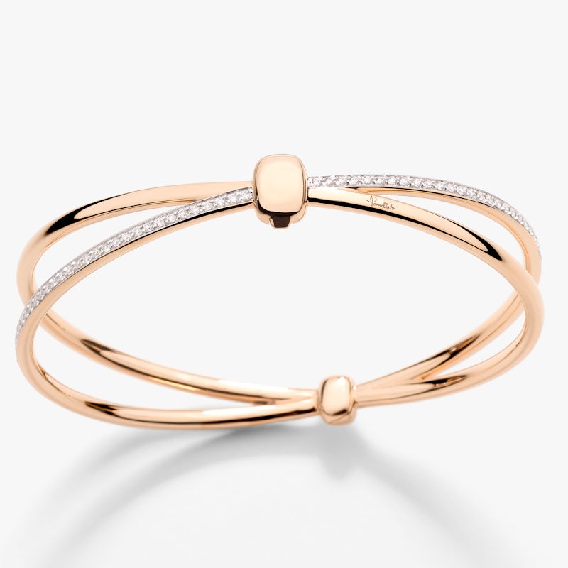 シンプルながら象徴的な「Pomellato Together」コレクション。愛の神秘をさまざまな形で表情豊かに語ります。人と人との結びつきを表現するブレスレットは、滑らかなローズゴールドにホワイトダイヤモンドをセッティングした、リンクで結ばれた特徴的なふたつのゴールドバンドが特徴です。